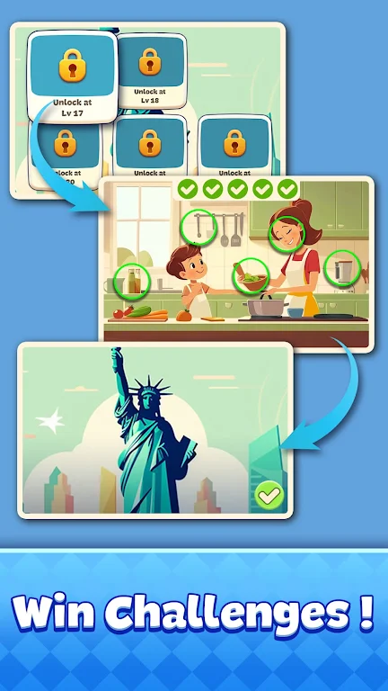 在找不同3:找找看!中,难度级别从简单到困难不等,关卡逐步解锁,以满足不同玩家的需求。初学者可以从简单关卡开始,逐步提升自己的技能和观察力。而对于那些挑战极限的玩家,困难级别的关卡将会带来更多的考验和乐趣。
