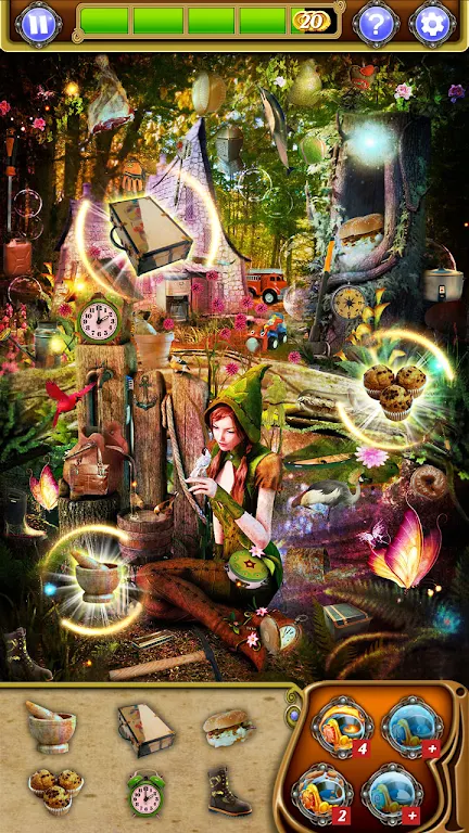 在隐藏物品 - 精灵森林中,你将面临各类挑战,需要在众多的场景中找到那些秘而不宣的隐藏物品。每一个场景都如同一个艺术作品,你的任务就是仔细观察并找到散落在其中的物品。通过集成的放大镜功能,你轻松放大场景,从中挖掘到那些难以发现的元素。