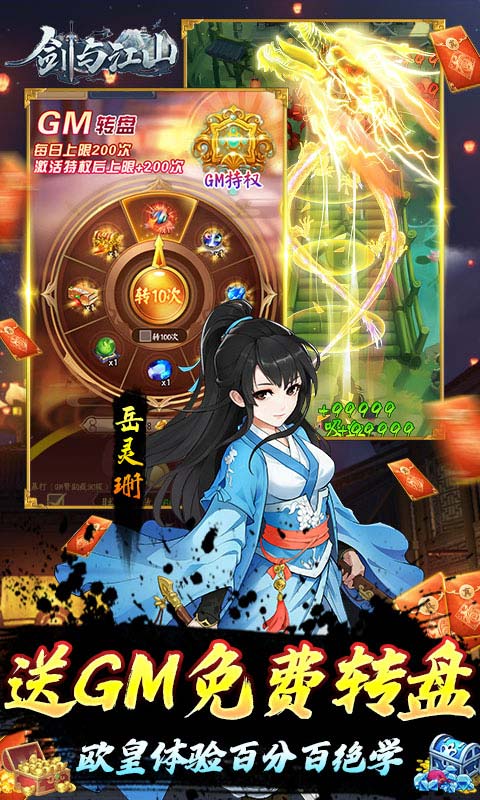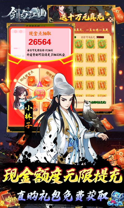 《剑与江山》国创武侠奥义对决手游大作,开局送十万真充,GM现金点提充代替真实支付!游戏以恢宏的大武侠为世界观,创新的武功对冲战斗系统,战前技能自由搭配、加上战中即时法宝操作,兼具策略性与打击爽快感。良心策划不顾老板阻拦,坚持开局就送给玩家免费直充648的劲爆福利,能充多少全看玩家手速!不怕额度被你点完,只怕玩家点到手软!游戏内的累计充值奖励统统能通过免费直充来激活,失传绝世功法、武林至尊神兵尽在掌握,海量元宝、银元、强化材料拿到包满,让您体验到创号即毕业的畅爽快感。躺着就能领红包,一直白嫖一直爽。快来玩《剑与江山》,海量福利领不完,仗剑江湖决胜天下!