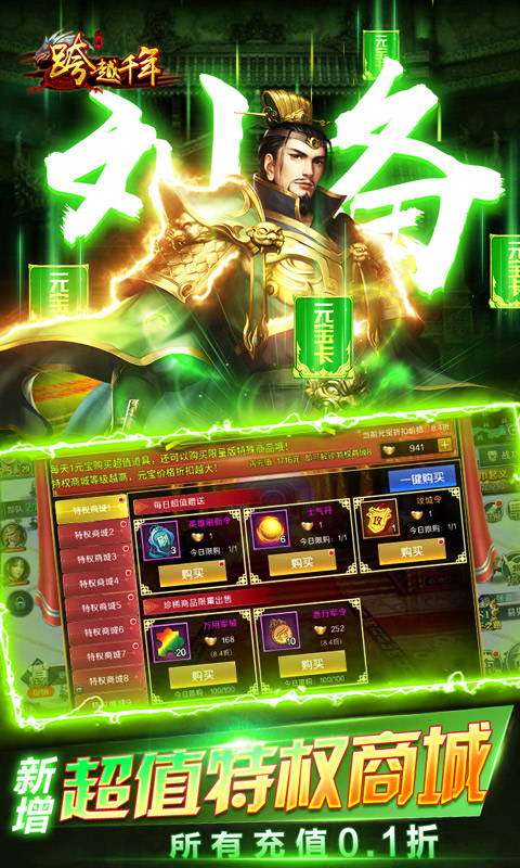 《跨越千年(三国争霸0.1折版)》是一款以三国为主题的全新战略战争手游,多样化的武将组合,精彩的技能组合,让玩家在趣味十足的游戏体验中感受回合制游戏的魅力。实时作战行动,不断在强化军队之中,让你成为霸主。游戏内所有充值档位,包括所有直购档位,全部0.1折,无次数限制,超值超划算