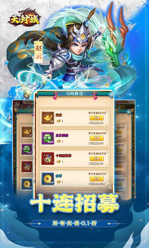 上线即送:上线送满V、GM1、138888元宝、金币1000万、十连招募、所有充值0.1折