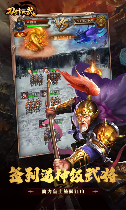 手游巅峰力作《刀剑演武》战争游戏重磅来袭。全新热血策略卡牌对抗闯关游戏,武道至尊,群雄汇聚!玩家可以与游戏中近200位历史名将结识,带领武将抗击敌人,让敌人胆战心惊!全新的武将羁绊系统助玩家打造最强国家队。庇护百姓,守卫山河的重担,还需天命者的你来肩负!