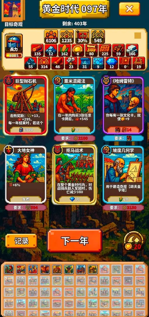 游戏的关键在于如何有效管理与分配资源,玩家需要把握每一轮的购买机会,以及恰当运用刷新系统。每年玩家只能刷新三次,在资源相对充足时,应尽量用完刷新次数,买入所需的卡牌。合理的资源分配能够帮助你实现持续的增长,为后续的游戏奠定基础。