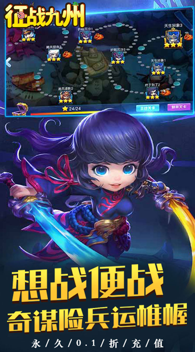 《征战九州(0.1折萌将争锋)》是一款3D回合策略卡牌手游。 游戏再现了关羽、张飞、赵云等经典三国人物英雄,以及虎牢关之战、官渡之战、赤壁之战等经典的历史战场。游戏拥有个性鲜明的时装,国风古韵的场景,绚丽多彩的技能;采用实时PVP玩法,回合策略激爽战斗,排兵布阵精彩对决再现三国乱世风情。战吕布,降群雄,谈笑之间樯橹灰飞烟灭;争虎牢,灭军团,杀敌破阵看三国时代谁主沉浮。