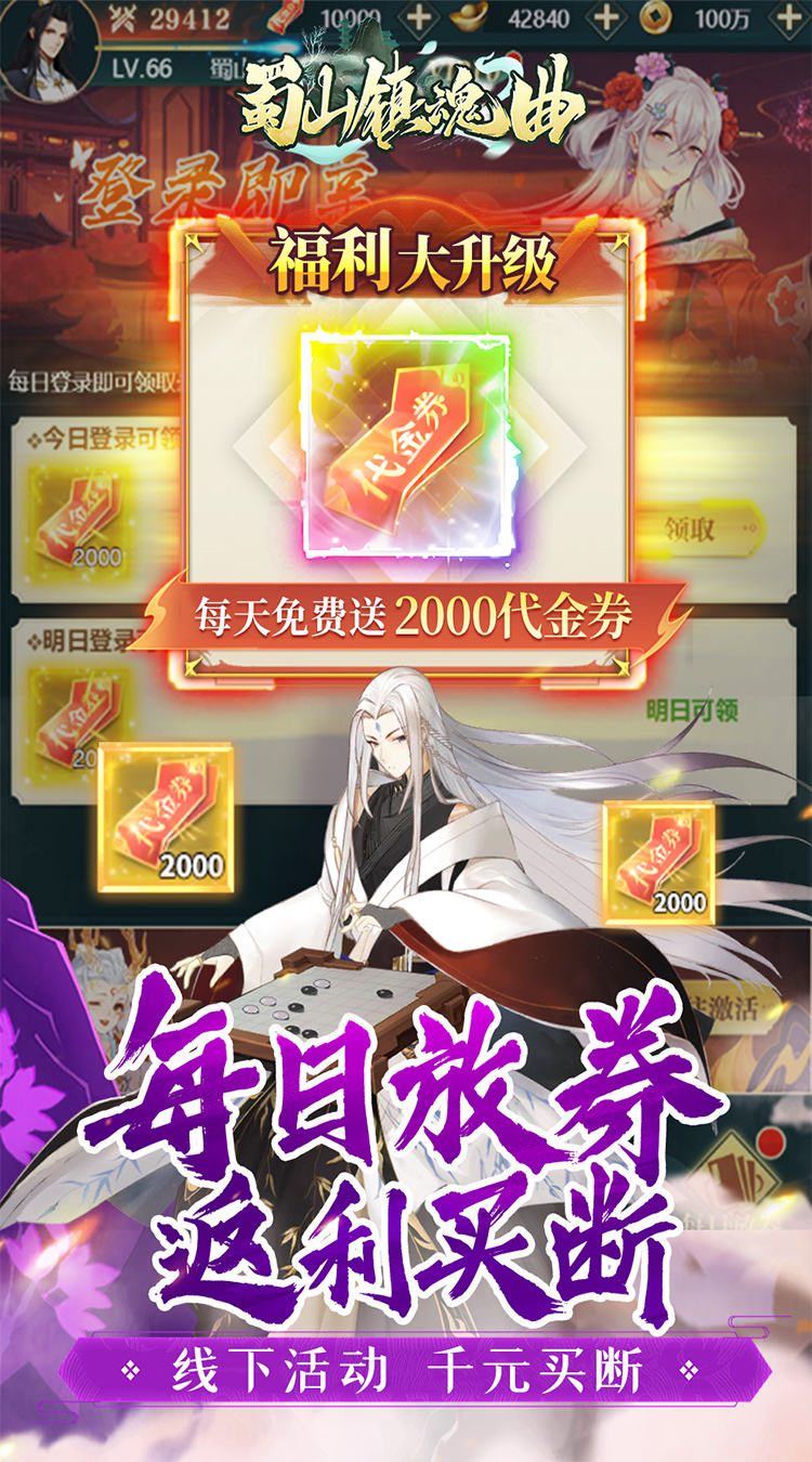1、拒绝数值膨胀,首续充值永久享受0.1折优惠,每日放券领取2000代金券