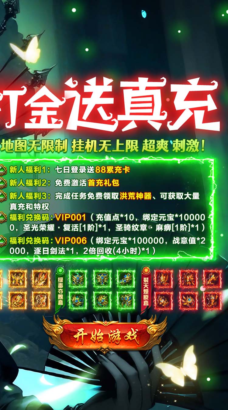 莽荒传奇(打金送真充)是一款沉默题材的传奇游戏,内置三折充值系统,游戏特色是可通过打怪掉落的实物兑换充值点,使用充值点可获取灵符和线上累充/冠名,创角送自动回收/拾取和会员卡、10万元宝,天天赠送200元货币;完成每日任务可获取大量实物和元宝奖励,七天每日登录还送88累充卡使用后直接免费领取首充奖励/线上累充,传奇画质精美,福利满满;线上更有多种不同的活动供你获取资源;还有跨服玩法;0氪也能变大佬。