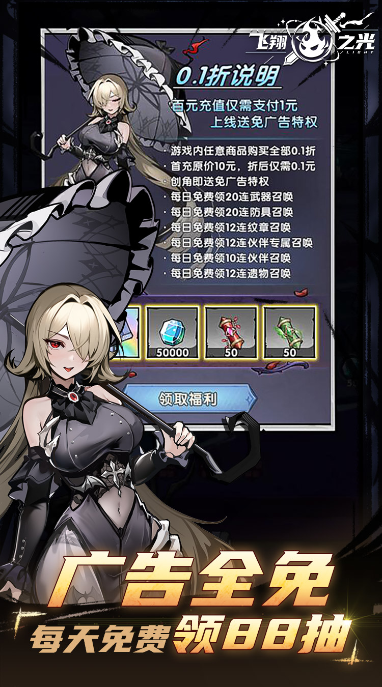 2、上线即送免广告特权+蓝钻*50000+武器召唤券*50+防具召唤券*50