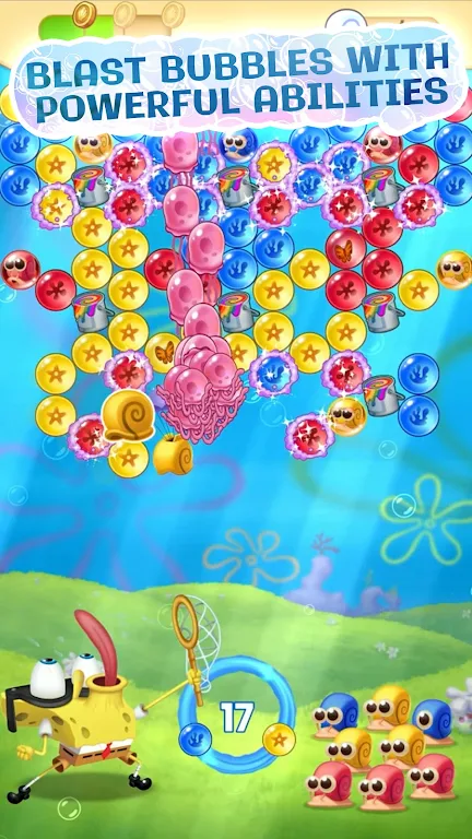 在《海绵宝宝:泡泡爆破》中,玩家需通过构建有效的泡泡消除策略来解决不同的关卡挑战。每一关都设计了独特的障碍物,你需要配对颜色并精准瞄准,将它们一次性炸裂。清除泡泡的过程中,海洋生物的救助也是一项重要任务,帮助它们重返安全的栖息地,令比奇堡重回繁荣。