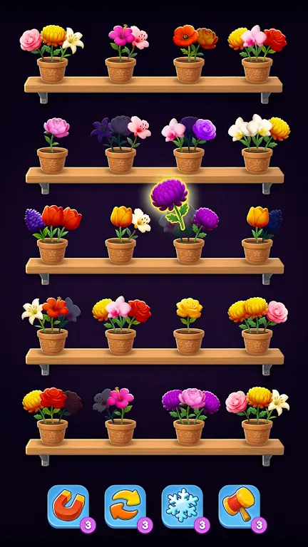 《花卉分类:花朵配对》的核心玩法十分简单,却又富有深度。玩家需要根据花朵的颜色将它们分类,并小心地将不同颜色的花朵放入匹配的花瓶中。每个关卡都需要你周密规划步骤,确保每一束花都得到完美的呈现。在这个过程中,你不仅能享受到逻辑思考的乐趣,还可以在解决难题时获得成就感。
