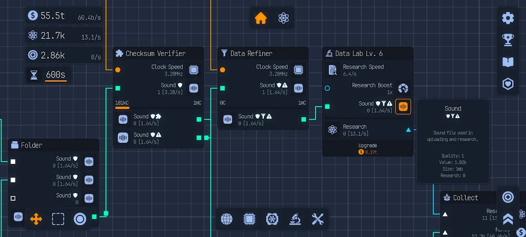 欢迎来到《上传实验室》。在这个激动人心的游戏中,你将肩负拯救宇宙的使命,面对不可避免的热寂危机。在这个充满挑战的环境中,你需要利用你的智慧和创造力,构建出一个通过节点系统优化的科技平台。每个节点就如同一个个窗口,代表着计算机的重要组件和进程。通过将这些节点进行连接,你能够控制资源流动和数据管道,确保系统高效运作。