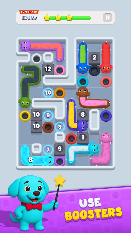 在《狗狗逃脱》中,玩家将使用简单而直观的拖拽操作来引导狗狗们穿越各式各样的障碍和迷宫。游戏的设计注重轻松上手与乐趣相结合,让每一个玩家都能快速理解并投入到游戏中。通过拖动每只狗狗的鼻子或尾巴,你将其引导到正确的路径和终点,解决各种精心设计的谜题。