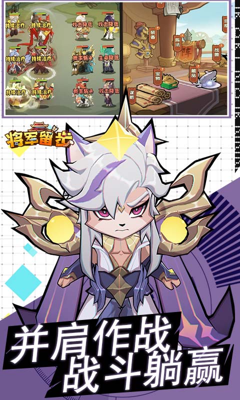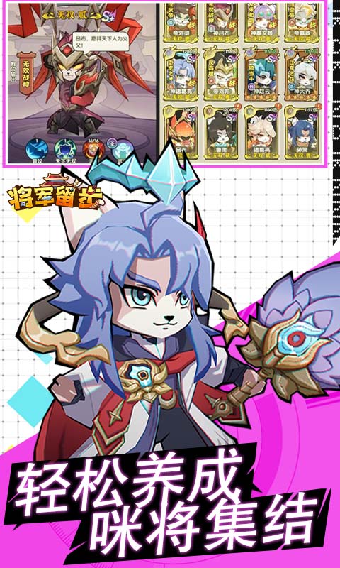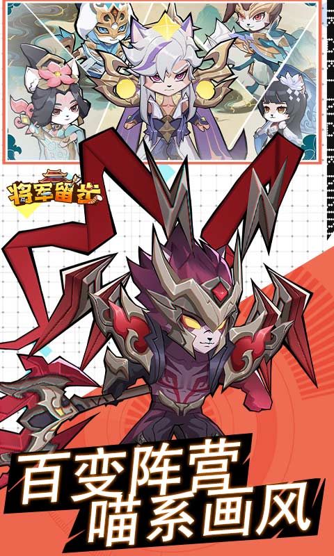 《将军留步》是一款以三国时期为背景、画风Q版猫猫形象的策略卡牌手游。全新0.1折福利来袭,游戏内所有充值永久0.1折,游戏融合经典三国历史元素,玩家将进入到一个由喵星人主宰的奇幻三国世界,在游戏中你将扮演一名主公,招募如忠勇无双的“赵云喵”、义薄云天的“关羽喵”、霸气侧漏的“吕布喵”,组建强大阵容。游戏采用回合制战斗模式,玩家需根据武将属性和技能制定战术。游戏的玩法是经典的卡牌养成、对战玩法,也加入了运镖、跨服争霸、红颜等创新元素。