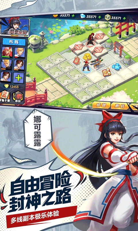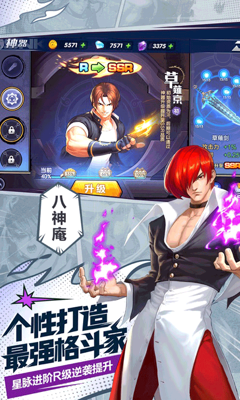游戏涵盖了草薙京、特瑞、不知火舞等“拳皇”系列经典人气角色及橘右京、娜可露露等知名人物。自由随心搭配阵容,炫酷技能连击不断,热血格斗情怀不止;升阶系统不断变强,陪伴主角从格斗菜鸟成长为格斗家的热血格斗之路