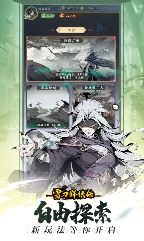 《雪刀群侠传》是一款新国风卡牌手游,你将在这个充满挑战的武侠世界中,邂逅众多个性鲜明的角色:英俊潇洒的少侠、妩媚动人的侠女、神秘莫测的隐士……他们各有独特的技能和故事,与你一起共度风雨,生死与共!体验纯粹的武林,感受真实的江湖!