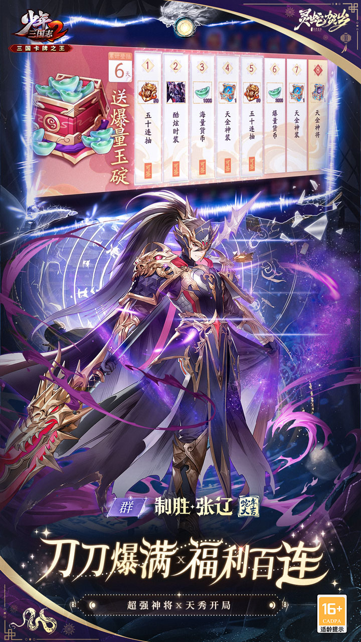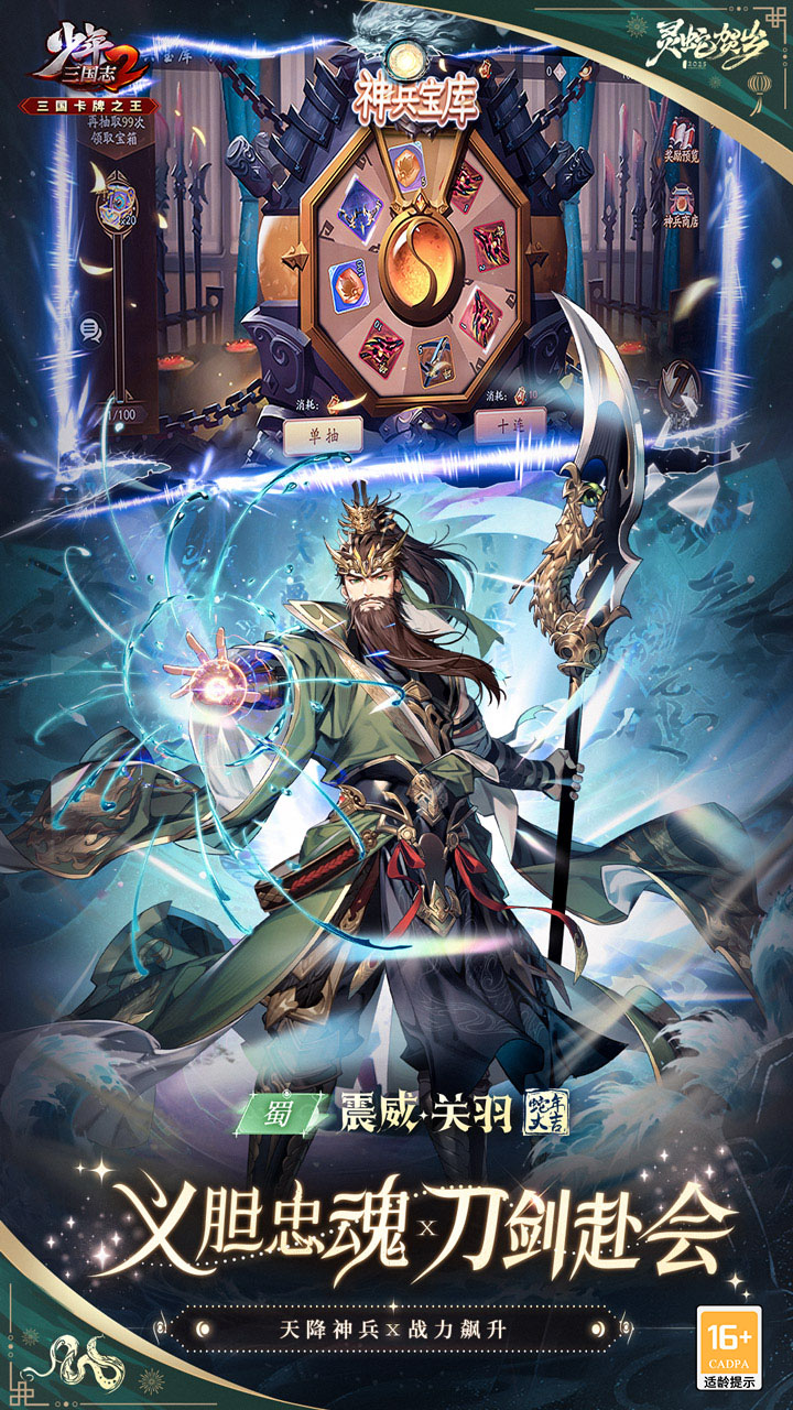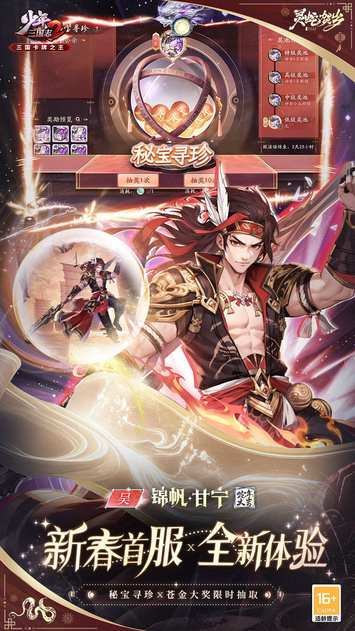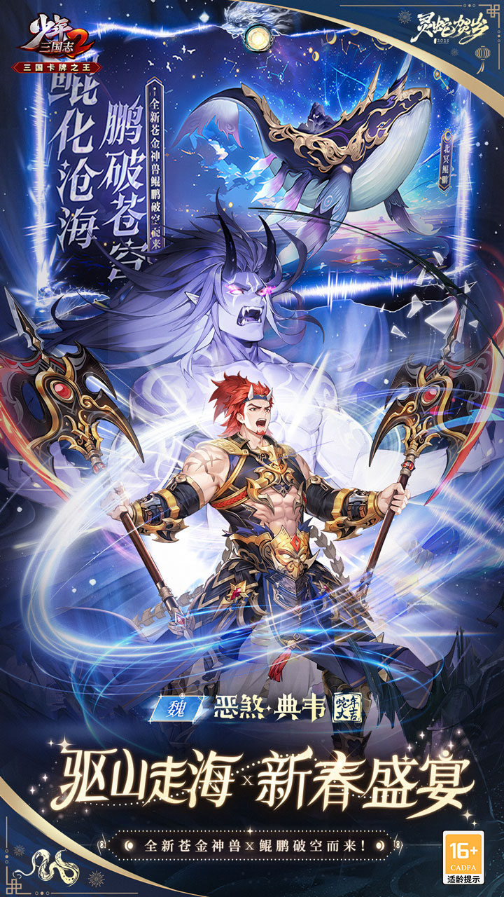 《少年三国志2》新春版本震撼上线!全新苍金五代武将【恶煞典韦】、【震威关羽】、【锦帆甘宁】、【制胜张辽】巅峰登场,助你所向披!全新神兵【七宝玲珑塔】降临,助你战力飙升!双重春节活动【年兽藏瑞】与【纳福迎春】上线,丰厚奖励等你拿!全新常驻玩法【发丘摸金】助你快速提升战力!春节超豪华礼包,苍金武将、装备大礼包等你领取,自动主线优化助力加速登顶!新春好时机,带上你的英雄一起创造传奇!