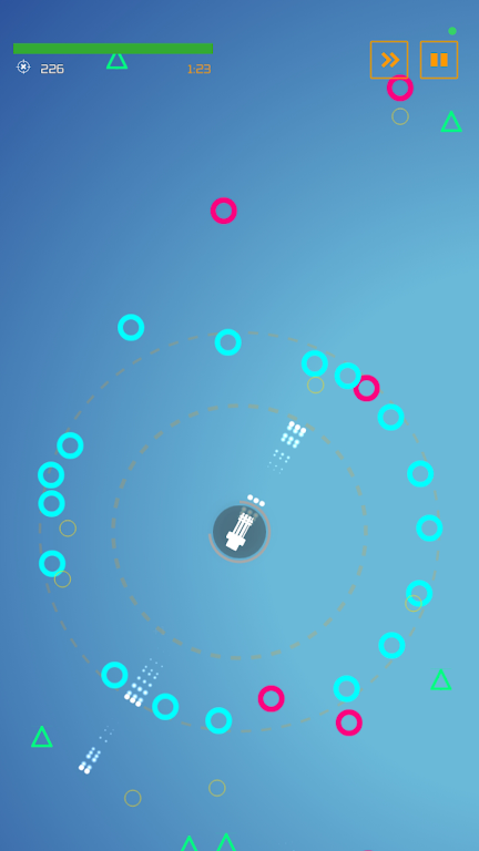 这款游戏采用了简洁的图形设计,视觉效果强调了游戏的清晰度和流畅感。在《PolyGun:放置塔防》中,敌人及特效均以极简风格展现,使得玩家不会分散过多注意力。这样的设计不仅提升了游戏的可操作性,也让战斗过程显得更加美观同时保持了极好的易懂性。