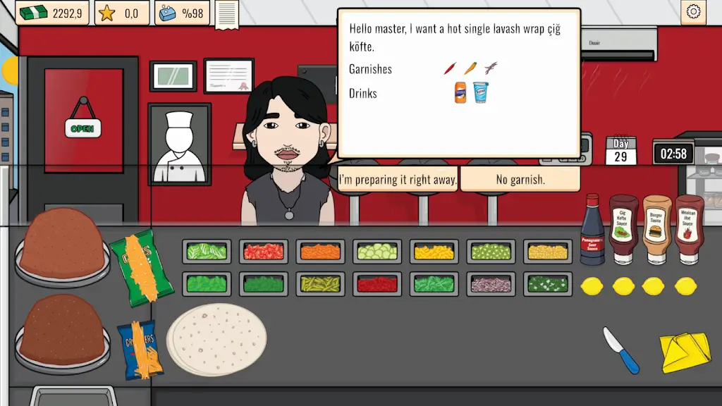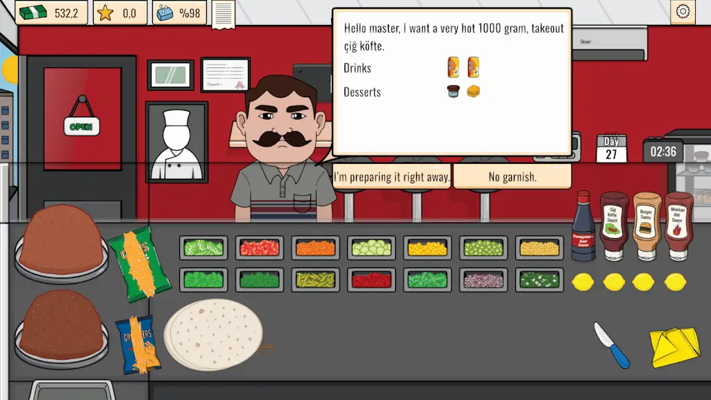 饮品也是吸引顾客的重要因素。您将有机会解锁饮料冰箱,为菜单增添各种冷饮选项。无论是清爽的饮料,还是独特的土耳其传统饮品,丰富的选择将会让顾客流连忘返。冷饮的搭配可以进一步提高您的销售额,实现盈利目标。