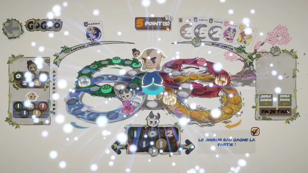 在《五行战纪》中,玩家通过使用三种不同类型的牌来实现移动和互动。牌的种类包括“阴”牌,允许玩家向后移动以调整位置;“阳”牌,可以帮助玩家前进,获取更多的查克拉;而“业力”牌则是用来与对手进行互动,可能改变局势,给对手施加影响。通过这些牌的灵活运用,玩家可以制定出复杂的策略,从而获得游戏的胜利。